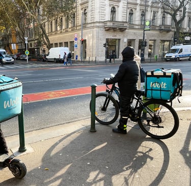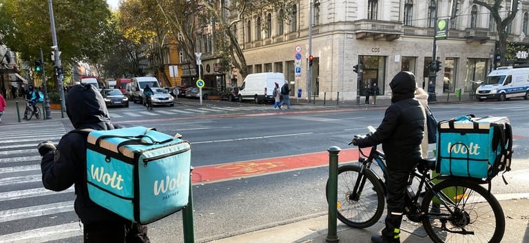 2024 m. lapkričio 18 d., Vengrija, Budapeštas: „Wolt“ pristatymo tarnybos darbuotojai laukia prie šviesoforo miesto centre.